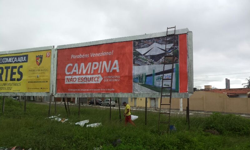 A campanha apresenta os dizeres: “Parabéns Veneziano, Campina não esquece os presentes que recebeu. Homenagem dos amigos ao aniversariante, neste 17 de julho”. Ao lado da frase, fotos de algumas das obras que marcaram a administração de Veneziano em Campina Grande. Ao todo são dez modelos de outdoor, cada um apresentando fotos de duas obras, totalizando 20, das mais de 3.500 obras e ações executadas, em oito anos de mandato: