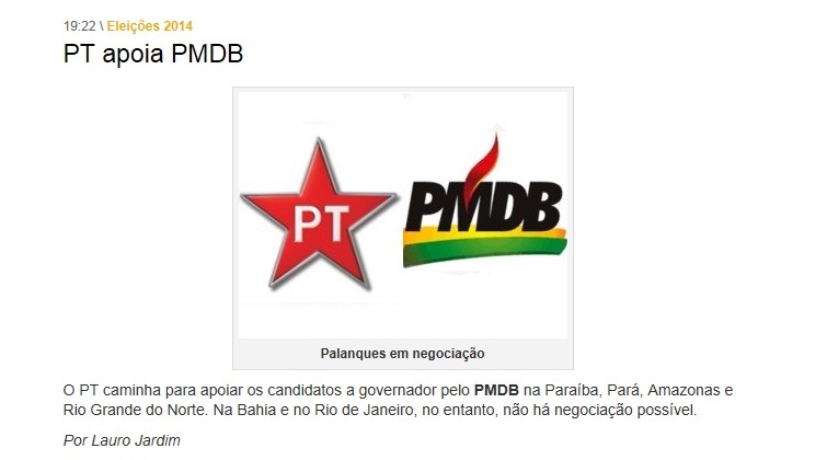 “O PT caminha para apoiar os candidatos a governador pelo PMDB na Paraíba, Pará, Amazonas e Rio Grande do Norte. Na Bahia e no Rio de Janeiro, no entanto, não há negociação possível”, diz o jornalista, com base nas últimas informações políticas que circulam nacionalmente, às quais ele teve acesso.