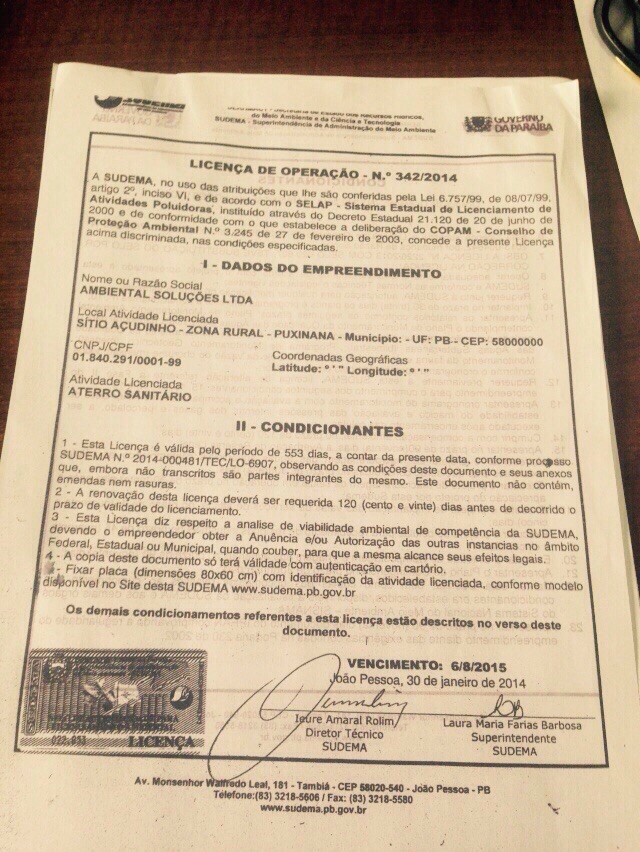 Cópia da Licença de Operação 342/2014, expedida pela Sudema em nome da empresa Ambiental Soluções Ltda (segue anexa) mostra claramente que a licença está em vigor, pois foi expedida no dia 30 de janeiro de 2014, com validade de 553 dias, vencendo, portanto, no próximo dia 06 de agosto deste ano, conforme processo na Sudema 2014-000481/TEC/LO-6907.